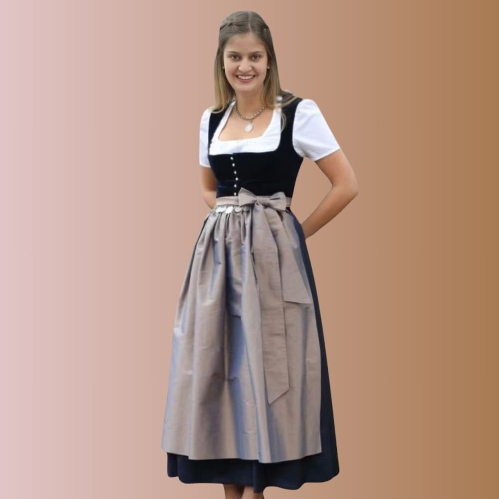 The dirndl originated in the Alpine regions of Germany, Austria, and Switzerland as a practical garment for working-class women. Over time, it evolved into a symbol of cultural pride and festive attire. Modern interpretations, like the black dirndl dress, retain traditional elements—such as the fitted bodice, full skirt, and apron—while incorporating luxurious fabrics like velvet for a contemporary edge.